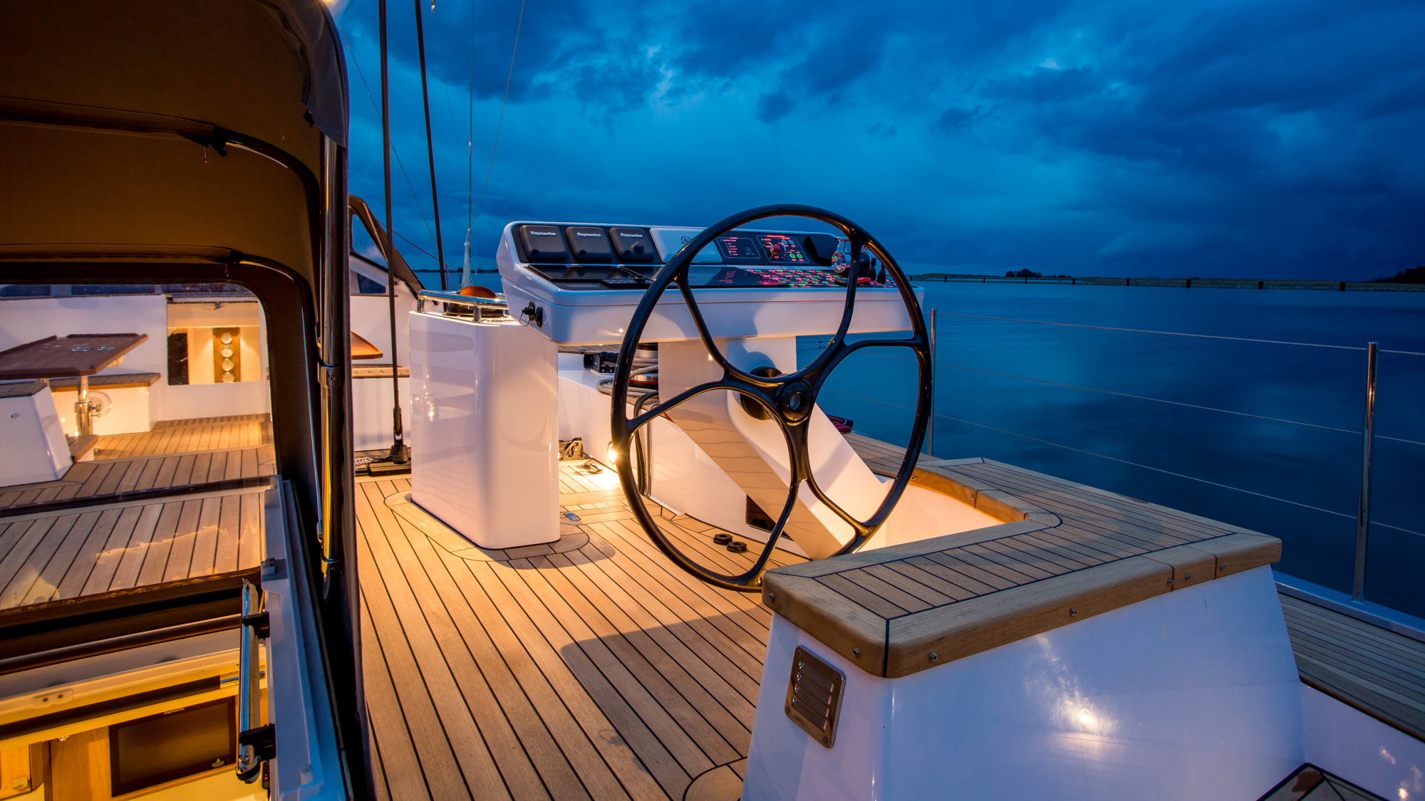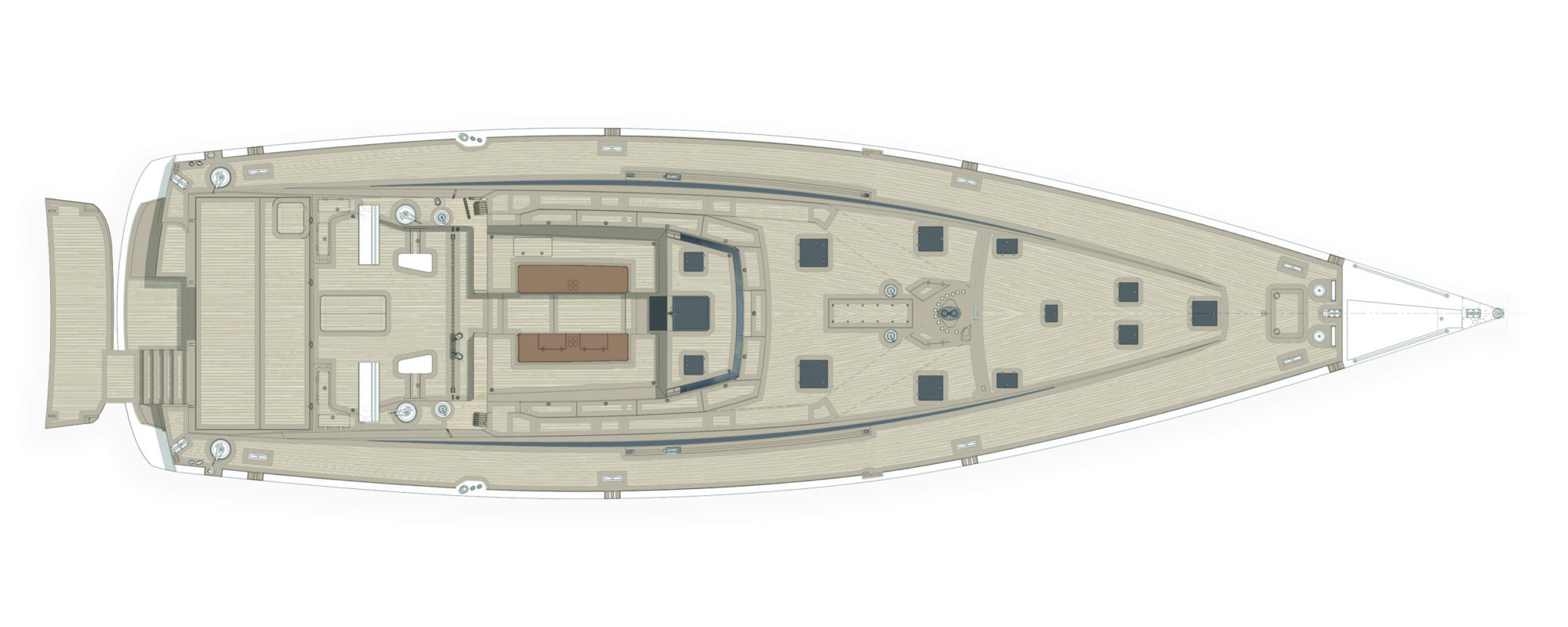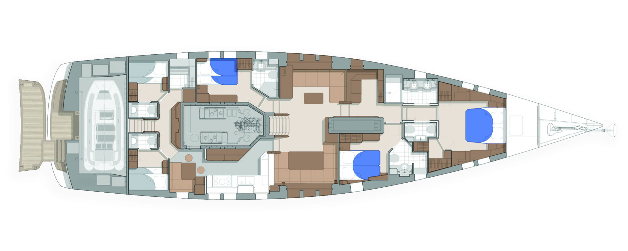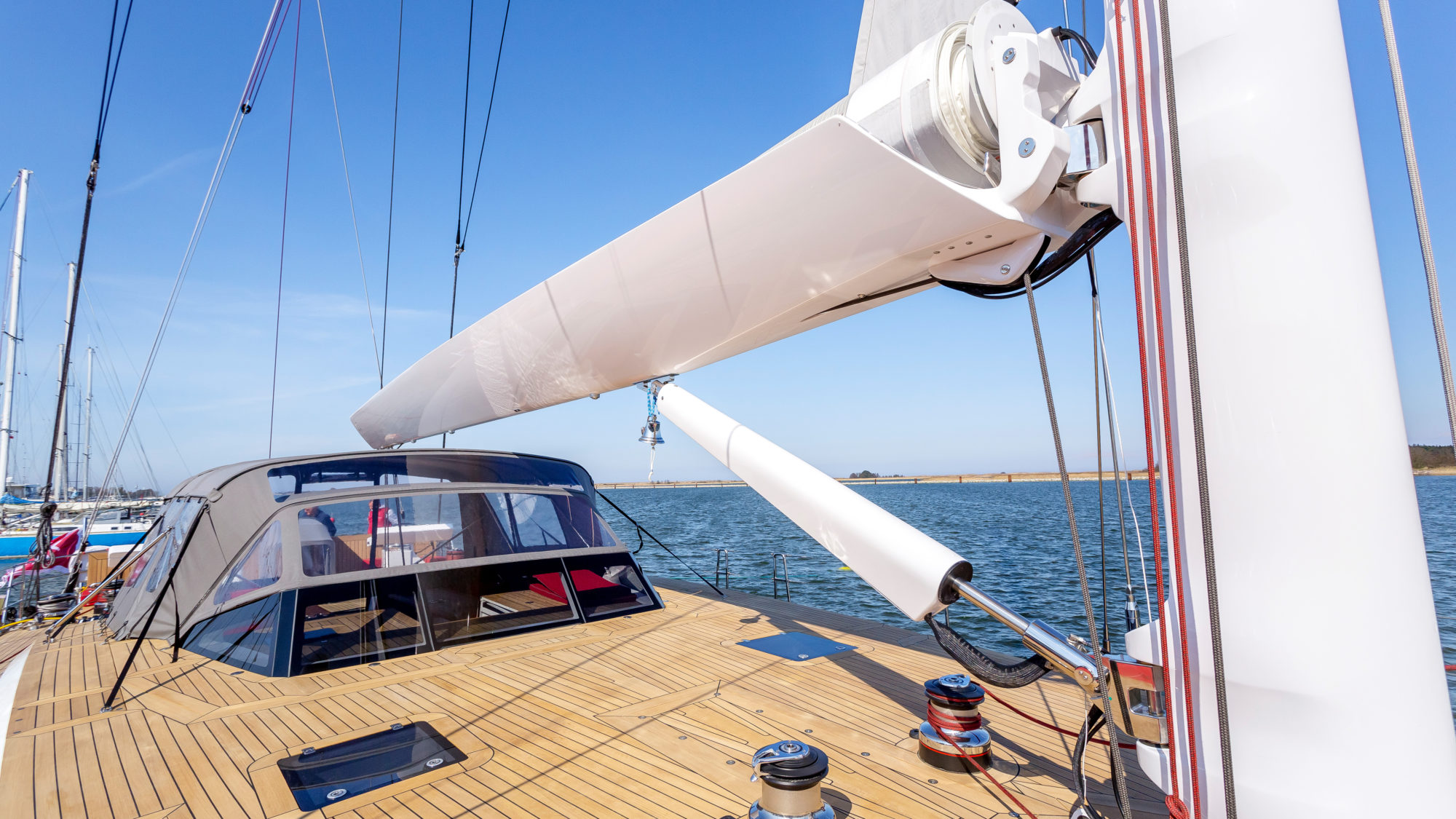 ✔ Rigging — If your plan was to sail with six guests, because of the limitation in space, you would need to be able to sail this yacht long distances with the minimal crew (4), thus requiring the most advanced rigging, canoe furling hydraulic boom, self-tacking staysail, an extensive hydraulic system for winches, steering, and lifting an 11,600 Kg bulb and 3800 Kg fin for a total of 15.4 tons!