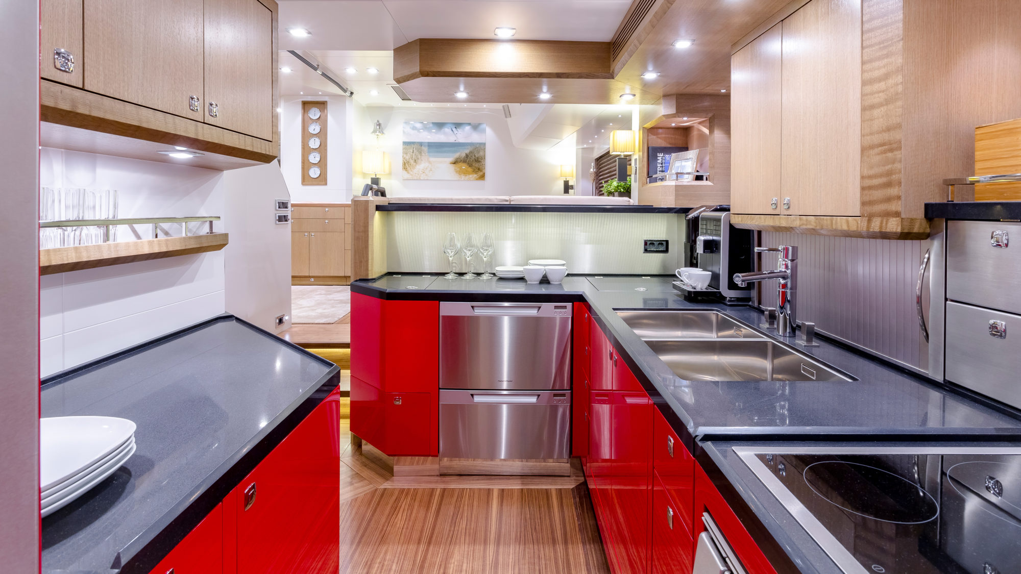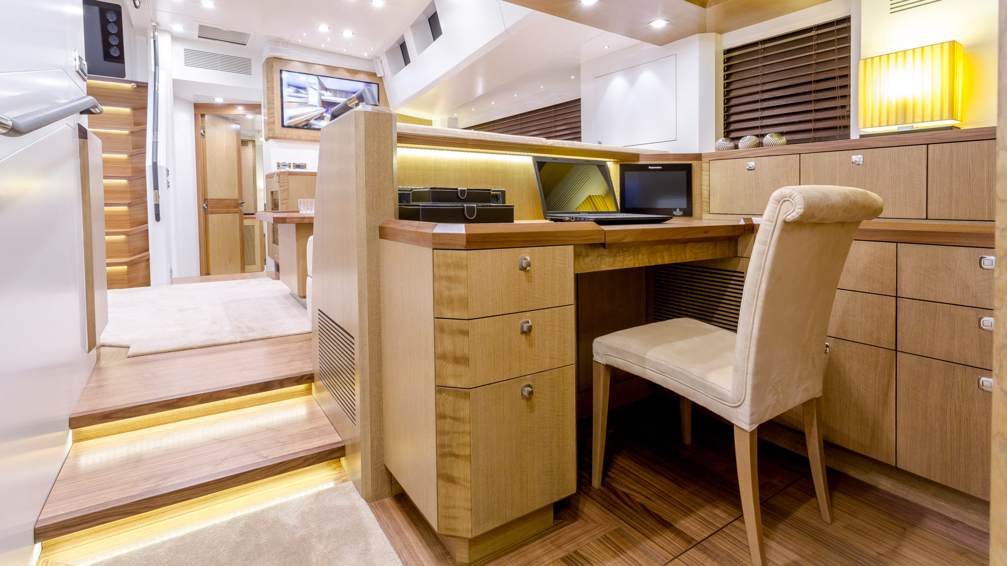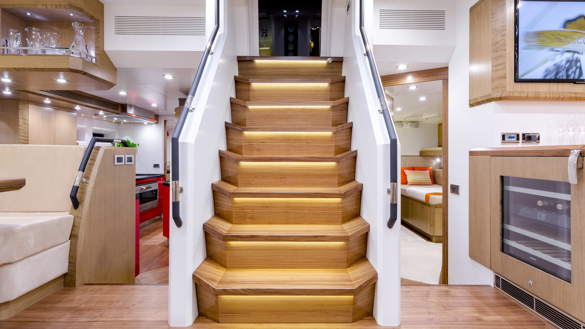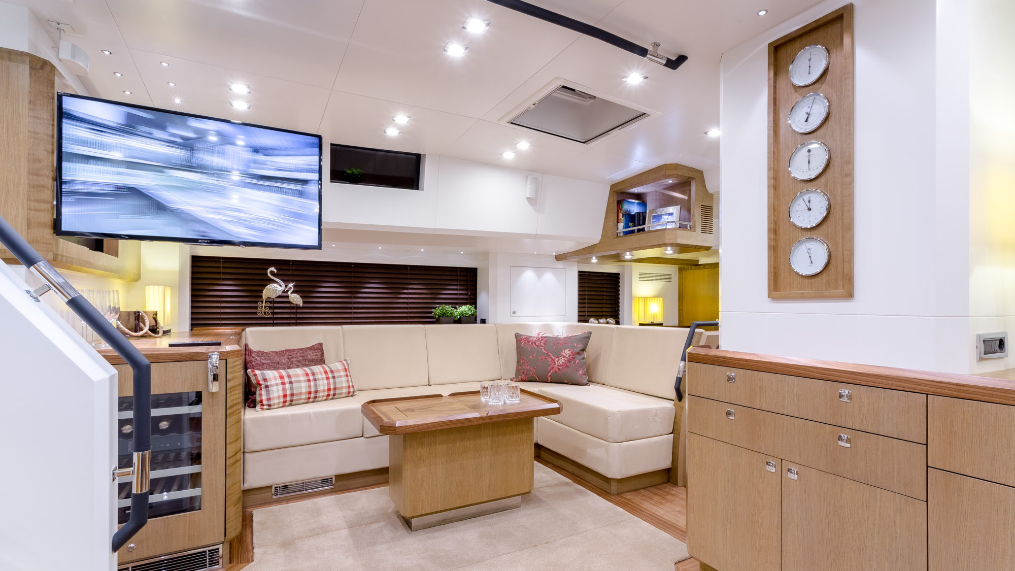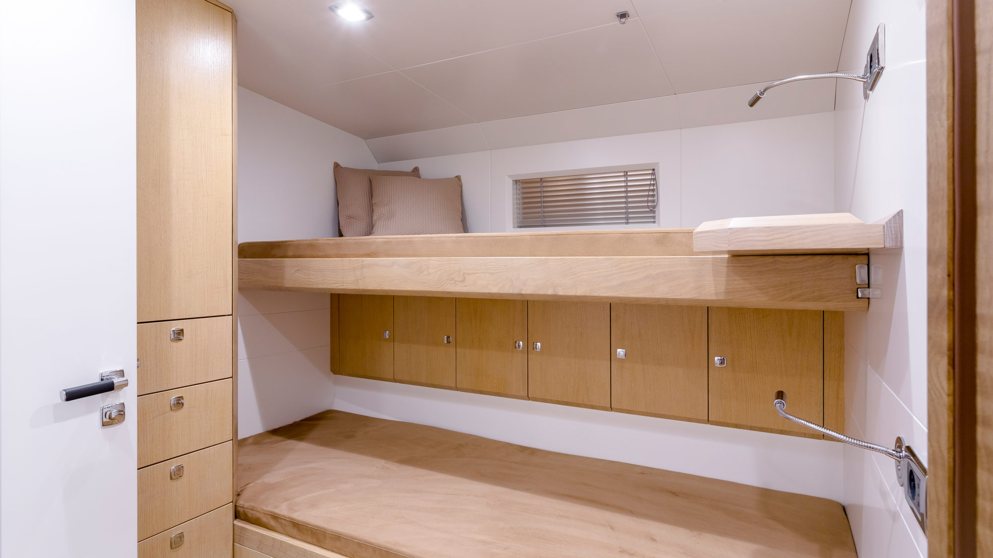 ✔ Rigging — If your plan was to sail with six guests, because of the limitation in space, you would need to be able to sail this yacht long distances with the minimal crew (4), thus requiring the most advanced rigging, canoe furling hydraulic boom, self-tacking staysail, an extensive hydraulic system for winches, steering, and lifting an 11,600 Kg bulb and 3800 Kg fin for a total of 15.4 tons!